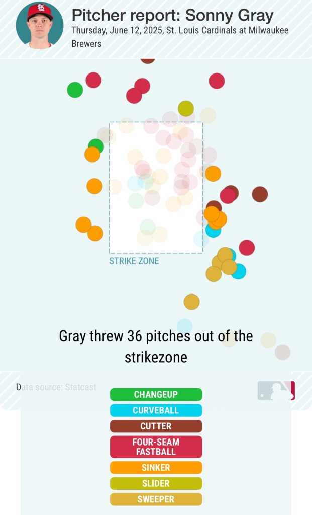 On May 14th, Gray lasted just 3.2 innings against the Phillies – the start immediately following his masterful 5/7 game over the Pirates – allowing 7 runs off 8 hits and a walk with just 4 strikeouts. Now, in this game – which was the second match in a double-header for the Red Birds – Gray threw just 77 pitches with 34 of them being either a 4-seam or 2-seam fastball averaging 91.6 MPH – but 40 of those 77 pitches were out of the strike zone, including 15 of those fastballs.