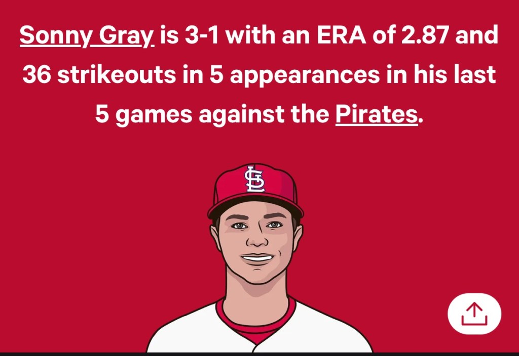 Gray has faced the Bucs twice this season (see here and here) and has been dominant both times, holding the Bucs to just 1 run off 5 hits over a combined 12 innings with 1 walk and 12 strikeouts, continuing a trend against the Pirates that preceded his time in St. Louis.