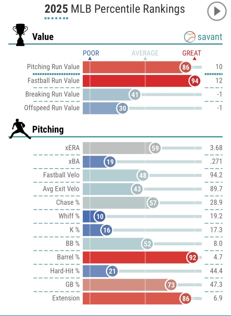 The 32-year old veteran righty is finding success despite mediocre strikeout and walk rates (17.3% and 8%, respectively) while benefiting from the highest strand rate of his career (85.8%) with much of this due to his ability to induce ground balls and avoid barrels.