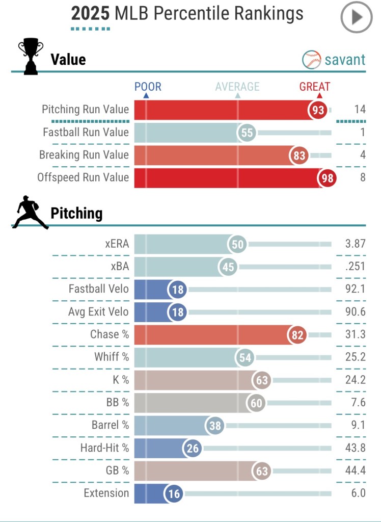 He gets strong chase rates and plus groundball numbers due in large part to his main offering: a high-80s changeup, which generates a 34% whiff rate and a .176 BAA.