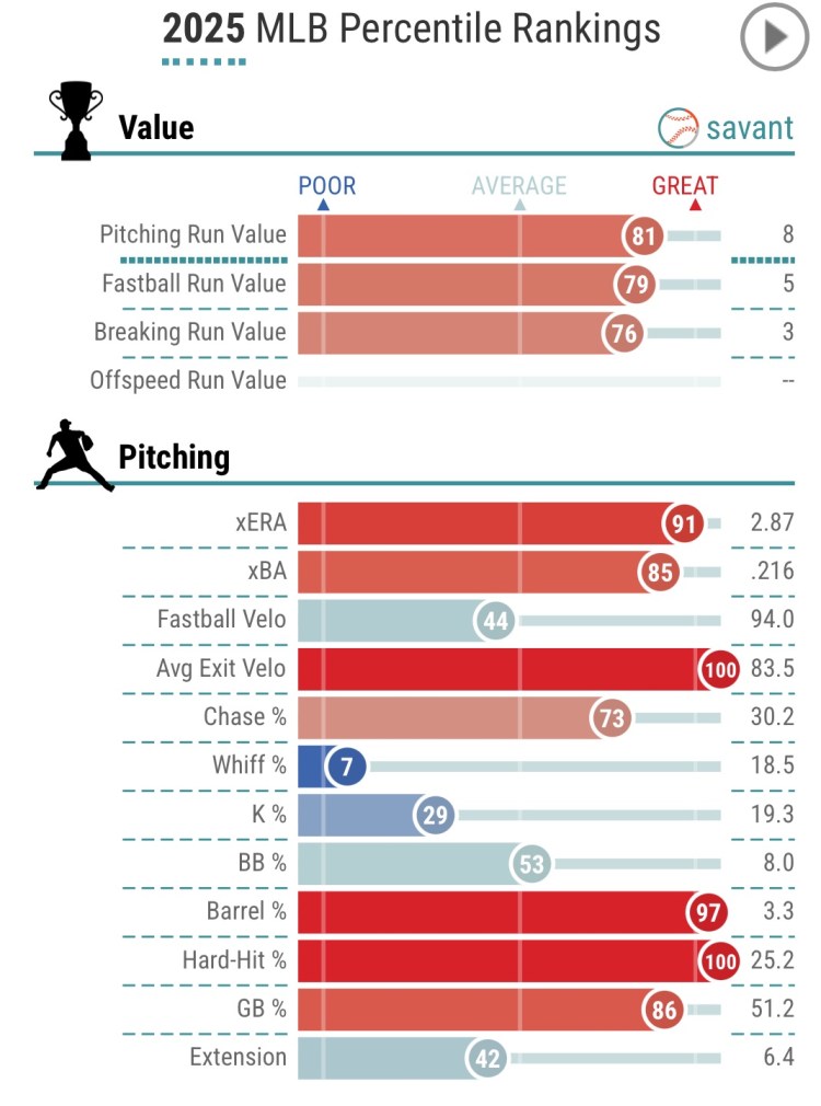 Ferguson, signed this past offseason to a 1-year deal, has been among the best in MLB at inducing soft contact with the 100th percentile average exit velocity (83.5 MPH), 100th percentile Hard Hit Rate (25.2%) and 97th percentile Barrel Rate (3.3%) all while posting a 2-2 record, 3.74 ERA and 1.09 WHIP through 43.1 innings of work for the Bucs.