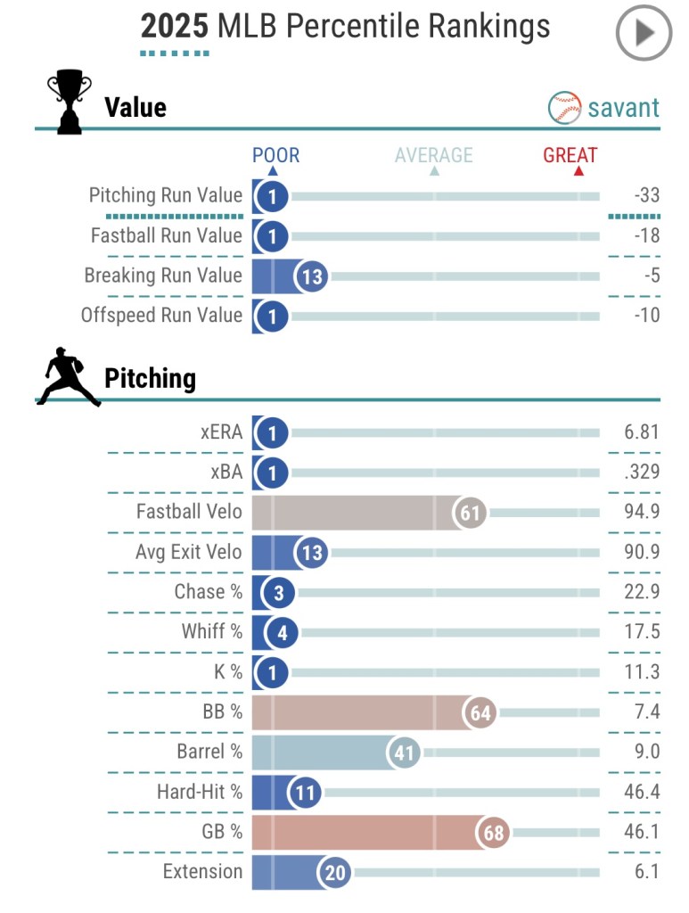 The Rockies 2nd highest paid player (behind only fellow starter, Kyle Freeland) offers a mid-90s fastball that can touch 98 which he pairs with a mid-80s slider, low-80s curve and a high-80s changeup. Only his curve ranks as a positive pitch – and minimally at that – as his overall arsenal ranks as the worst Run Value in MLB.