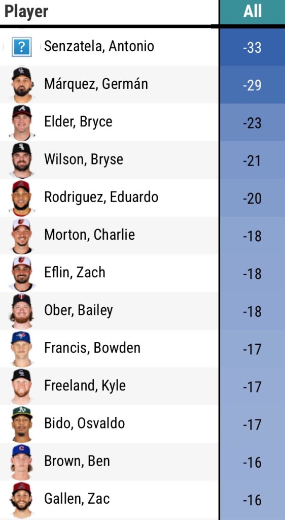 Senzatela is arguably the worst starting pitcher in baseball this season as he leads MLB in hits allowed (152) and losses (14). Among pitchers with at least 100 innings, Senzatela has the lowest K rate (11.3%) with both the highest WHIP (1.84) and ERA (6.68), and has had more starts where he’s allowed 6 or more runs (5) than he has posted a shutout performance of just 4 innings or more (4).