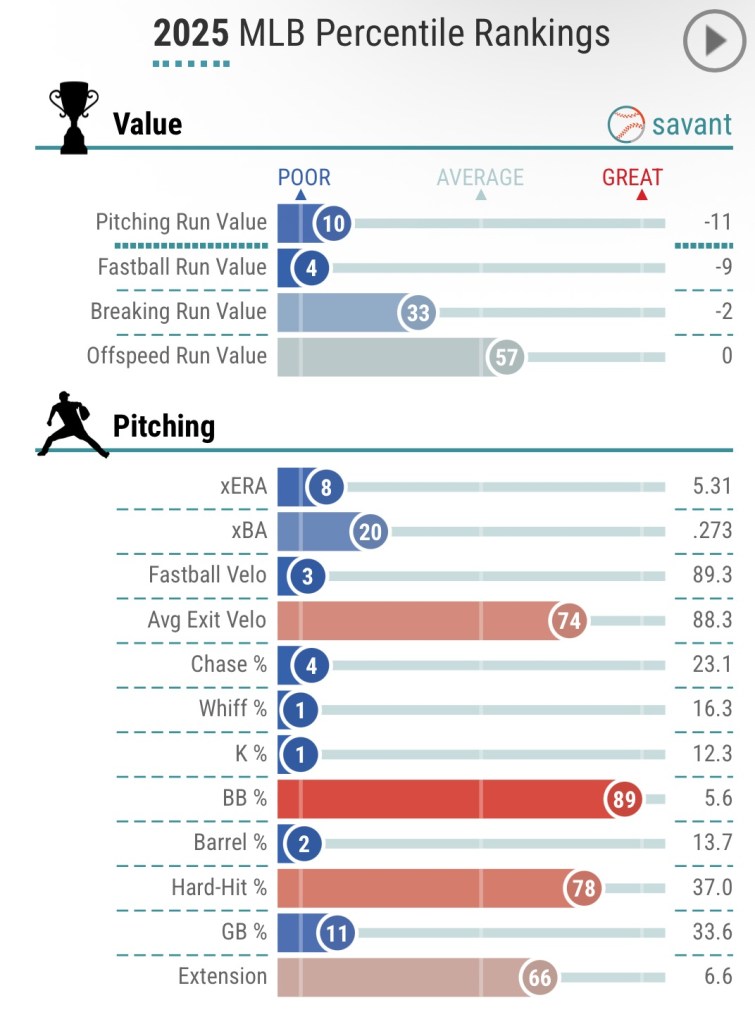 With a career-low strikeout rate (12.3%), career-highs in both oBA (.321) and WHIP (1.66), he might be yearning to go back on the Injured List at this point.