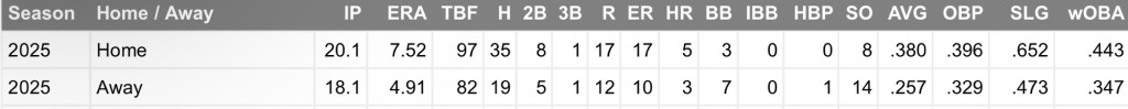 Unfortunately for him, with the vast terrain of Coors Field, those balls tend to find grass as he has a 7.52 ERA through 20.1 frames at home compared to a slightly more serviceable 4.91 ERA over 18.1 innings on the road – and much of that damage at home has come via the small ball.