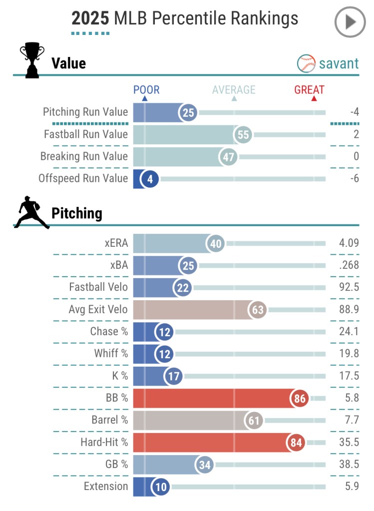 He also displays above average walk rates as his 4.1% mark ranks behind only Tarik Skubal (3.8%) and Sonny Gray (4.0%) among qualified starters but when he works in the zone and gets swings, the opponents can do some serious damage.