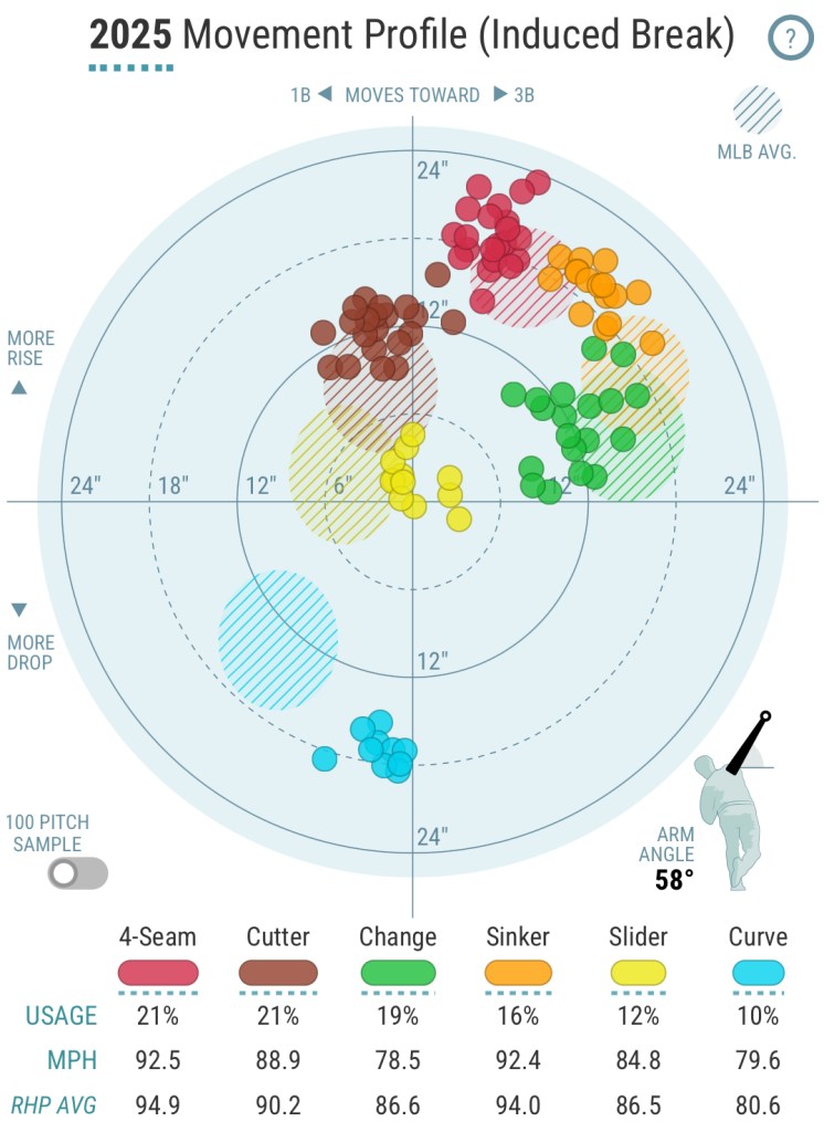 Martinez doesn’t have any overpowering pitches, relying on a diverse arsenal while changing locations and speed to keep opponents off-balance and generate weak contact. His six pitches have a usage ratio of at least 10% with above-average vertical movement on both his changeup and curve.