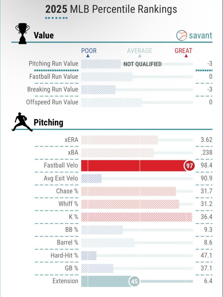 The Reds rookie is among the best in MLB since his debut at both generating whiffs and getting opponents to chase (no pun intended) – as well as overall generating strikeouts with the 3rd highest K rate (36.4%) since his debut for starting pitchers with at least 20 innings pitched in that time behind just Tarik Skubal (38.3%) and fellow NL Central rookie, Jacob Misiorowski (39.6%).
