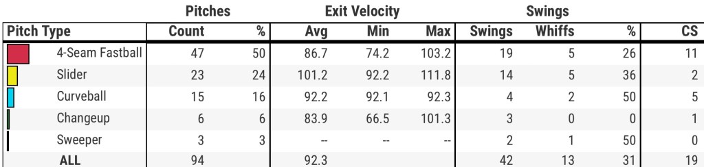 He leaned heavily on a fastball-slider mix getting 5 whiffs on each of the pitches. The fastball, in particular, resulted in 3 of his 7 strikeouts with the other 4 coming off the slider/sweeper combo.
