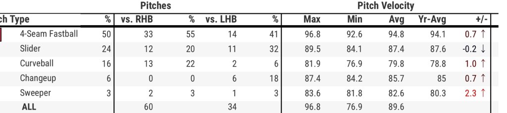 Overall on the season, it has been an effective offering for him as he uses it as his primary pitch versus lefties while mixing the sinker/sweeper combo to keep the ball low and generate ground-balls.