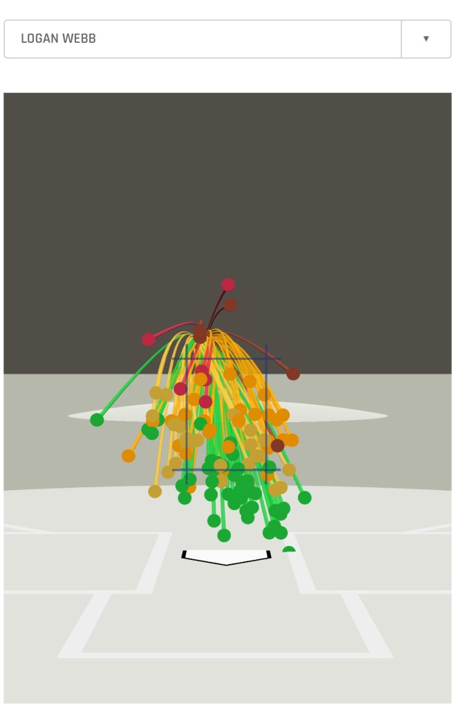 While Webb hasn’t surrendered any home runs off the pitch, the average exit velocity of 92.2 MPH (highest among his arsenal) and 0 degree launch angle suggests that the right type of hitter who can drop the barrel down with the movement of the ball could potentially be the first to ring the bell on Webb.