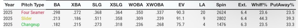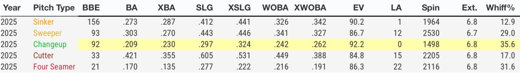 On the other side of that, however, is the reality that when opponents do make contact on the pitch, they make sure it’s solid as his 47.8% hard hit rate against his changeup is the highest among that same qualifying pool of pitchers.