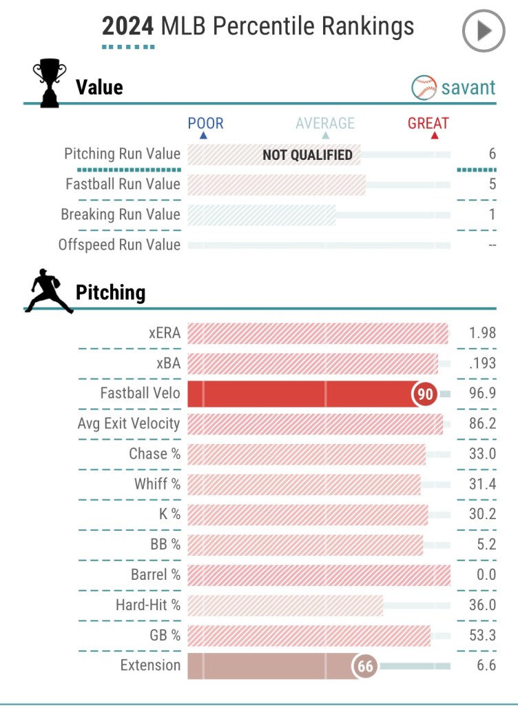Ramussen returned in 2024 with a vengeance as he posted career best rates for strikeouts (30.2%), walks (5.2%), barreled balls (0%) and average exit velocity (86.2 MPH).