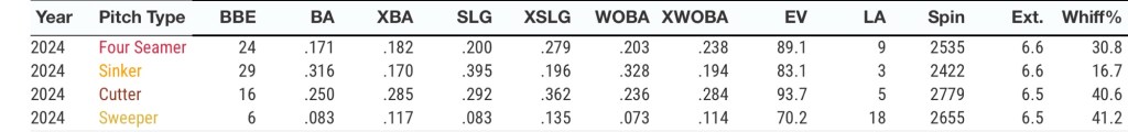 Looking at his pitch mix, he offers a high-90s 4-seamer which can touch 100, a mid-90s sinker which aids in his well above-average ground ball rate (career 48.5%), a high-80s cutter with sharp break down and away from lefties and a mid-80s sweeper that he will typically deploy down and in against right-handed hitters.