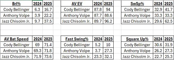 These are all on their face, impressive results. I think that this is going to be an incredibly fascinating experiment to continue tracking in 2025. It must be mentioned however, that the BBE sample size is extremely small (8,9,11 respectively). Generally these rates do not begin to become stable until after 50-70 BBEs.