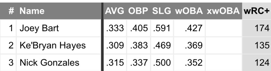 Given that Nick Gonzales is out of commission for the foreseeable future, we really only have two bats that fit this criteria.
