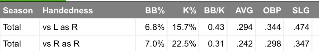 That said, he has a very short track record of limited success, has struggled early on this season and even against lefties where he appears to be at an advantage, he struck out at a higher rate than against righties (29.7% compared to 24.5%) and a lower walk rate (6.8% against 8.2%).