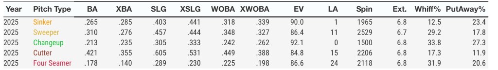As mentioned previously, his success is backed by a deceptively strong 4-seam fastball – which sits mid-90s but can touch 98 – as opponents are batting just .187 against the offering. He has been throwing the pitch constantly (62.5%) and it has resulted in 52 of his 69 strikeouts on the year thus far due in large part to his above-average extension leading to one of the highest run values on the pitch in MLB.