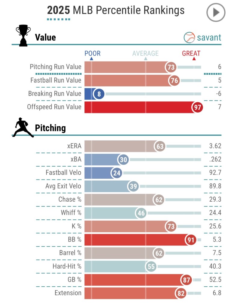 He gets strong chase rates and plus groundball numbers due in large part to his main offering: a high-80s changeup, which generates a 34% whiff rate and a .176 BAA.