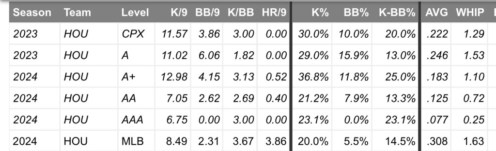 The 23-year old, 3rd round pick out of Georgetown shot through the Houston system, making just 19 minor league appearances and totaling 80.2 innings before his jump to the bigs last month. The Astros 9th ranked prospect showed strong strikeout numbers in the lower levels (30%+ between A/A+) but wasn’t able to replicate that rate against improved competition and has seen it drop to 20% over his first 3 MLB outings.
