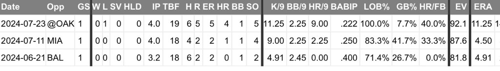 While his first start came against a very good offense in Baltimore (4th in run scored), his last two outings versus Oakland (20th) and Miami (29th) similarly saw him get hit hard.
