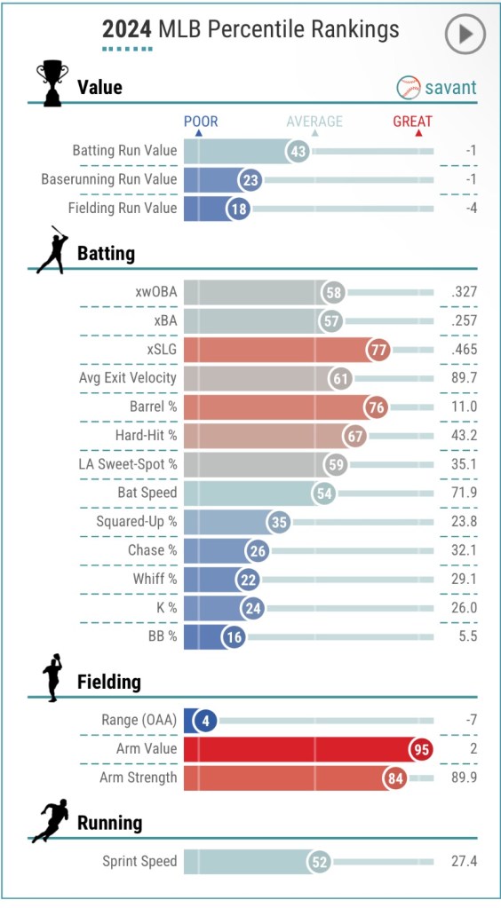 Defensively, De La Cruz comes in with a -7 OAA, but his arm is among the best in baseball, so slotting him into right field should be fine and he can definitely hold runners with the best MLB has to offer.
