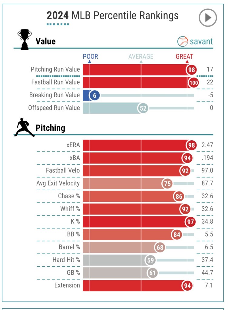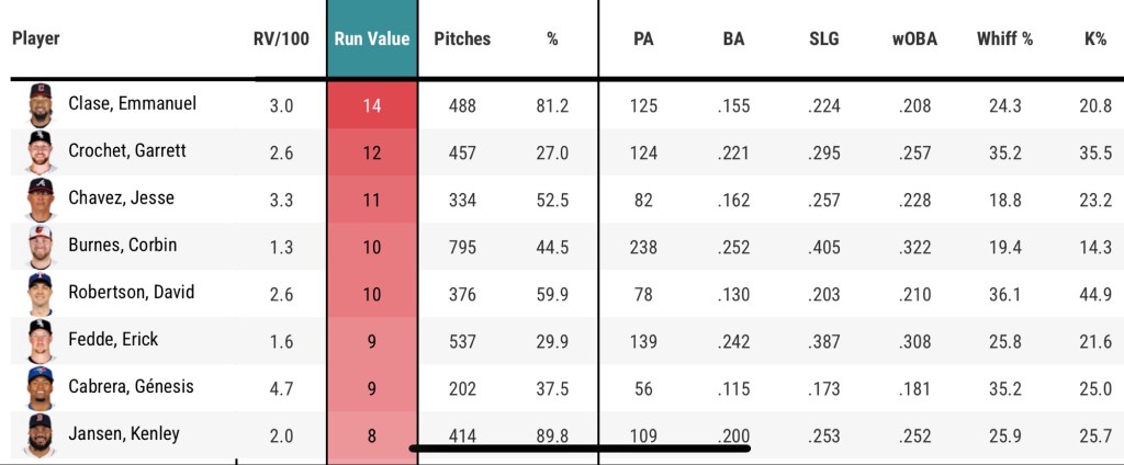 The Southside Southpaw primarily works off his high-90s 4-seam which can touch 100 at times and low-90s cutter that has been just unhittable – ranking with the highest run value among all starting pitchers and only behind Guardians closer, Emmanuel Clase.