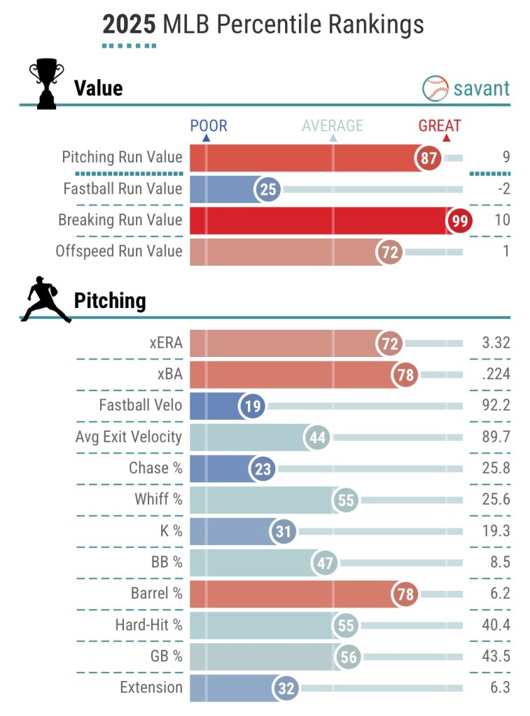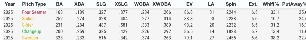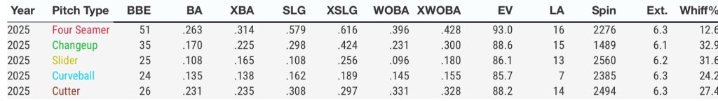2025 saw Arnold toss 84.2 IP going 8-2 with a 2.98 ERA, 2.95 FIP, 119 K/27 BB. If you think you see shades of Chris Sale here, I’d be inclined to agree. I am not saying that as a direct comparison by any means, but there are some definite similarities.